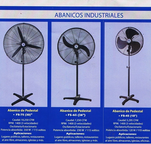 Descripción: Ventilador industrial, totalmente metálicos, montados en roles, 110 v, aspas en aluminio, De Pie y Pared.