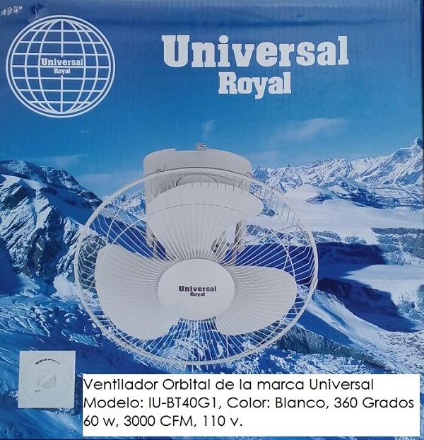 Descripción: Ventilador Orbital, 16" de aspa, parrilla protectora, 360 grados, 3 velocidades, 110 v, 60 w. Color Blanco. Control de pared