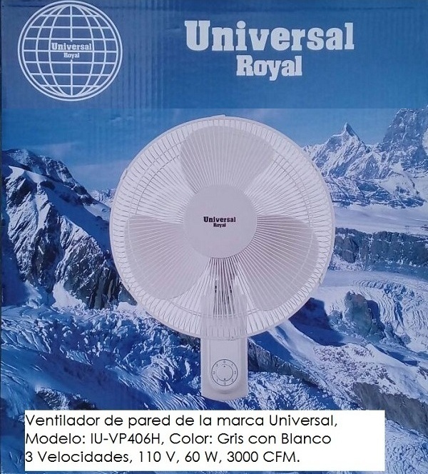 Descripción: Ventilador pared, 16" de aspa, parrilla protectora, 180 grados, 3 velocidades, 110 v, 60 w. Color Blanco.