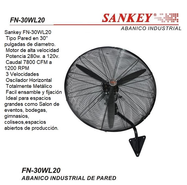 Descripción: Ventilador de pared industrial, 30" de aspa, potencia 280 w, 110 v, 3 velocidades, oscilante o fijo, Ideal para salón de eventos, gimnasios y otros.