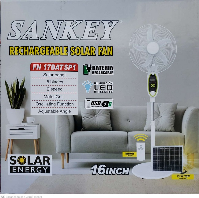 Descripción: Ventilador de 16", Bateria recargable, 5 aspas, 9 velocidades, 110/220 v 50/60 Hz, panel solar, iluminación led