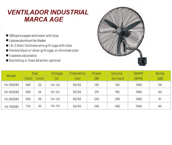 Descripción: Ventilador industriales de pared de la marca AGE, UNIVERSAL en diferentes medidas